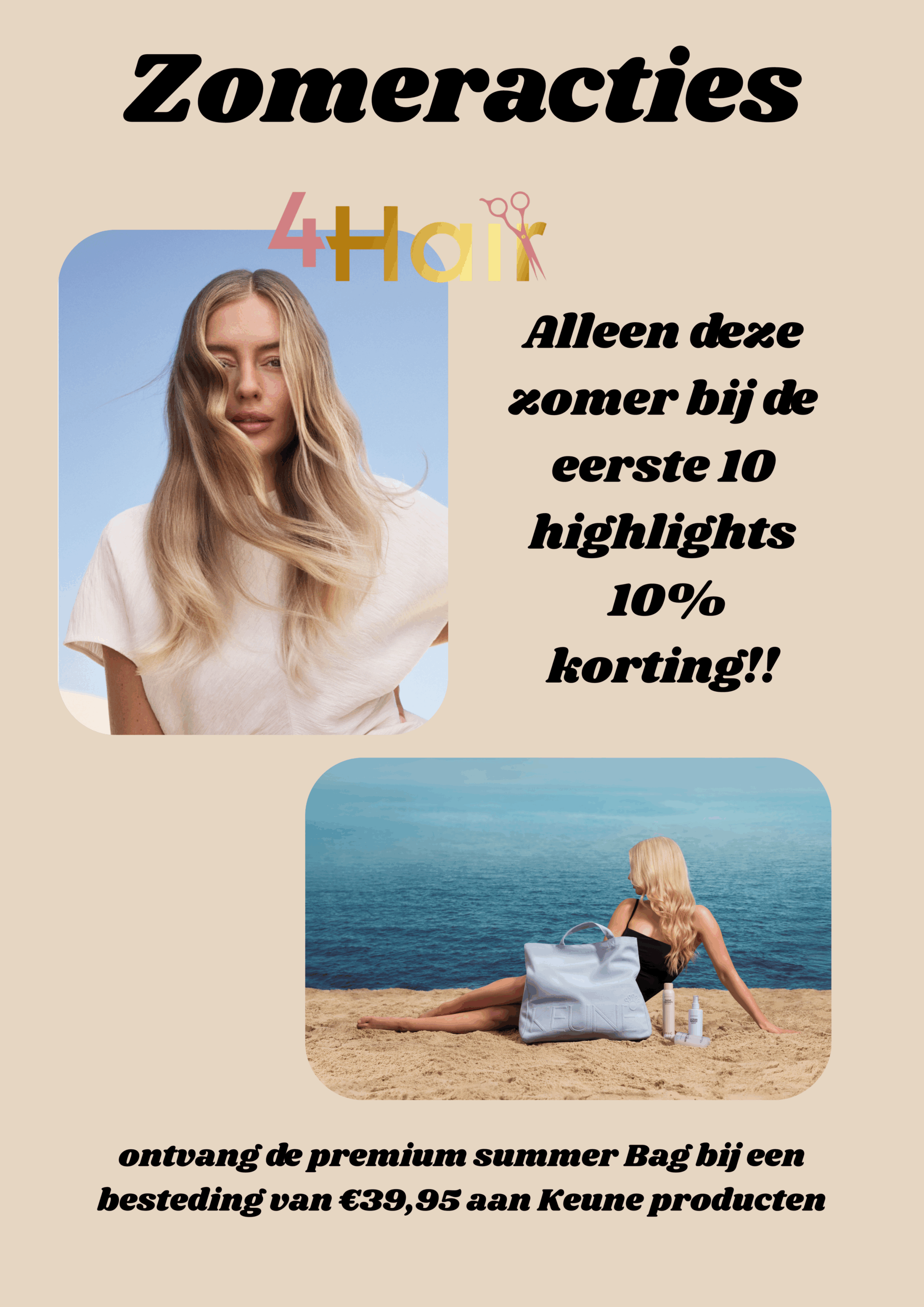 bent u ook toe aan een nieuwe zomerkleur in u haar? bij ons in de salon hebben wij een leuke actie! Alleen deze zomer bij de eerste 10 highlights 10% korting. Deze actie is geldig t/m 30 September, dus boek snel jou afspraak! ps: de afspraak kan alleen telefonisch of in de salon geboekt worden..